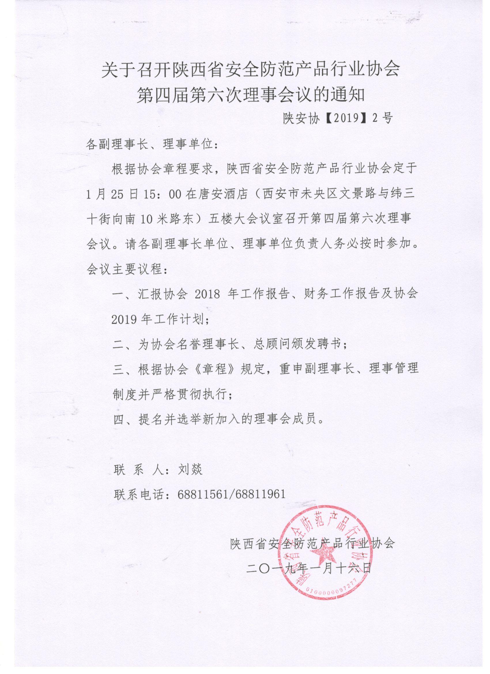 根据协会章程要求,陕西省安全防范产品行业协会定于1月25日15:00在唐安酒店(西安市未央区文景路与纬三十街向南10米路东)五楼大会议室召开第四届第六次理事会议。请各副理事长单位、理事单位负责人务必按时参加。 会议主要议程: 一、汇报协会2018年工作报告、财务工作报告及协会2019年工作计划; 二、为协会名誉理事长、总顾问颁发聘书; 三、根据协会《章程》规定,重申副理事长、理事管理制度并严格贯彻执行; 四、提名并选举新加入的理事会成员。